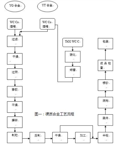將碳化鎢和鈷按所需的比例進(jìn)行配制,然后加入酒精,進(jìn)行球磨。球磨后經(jīng)干燥、過(guò)篩、加入成型劑,在進(jìn)行干燥、擦碎過(guò)篩,便得到所需的混合料?;旌狭纤腿ミM(jìn)行壓制。壓制品在經(jīng)燒結(jié),變成最終成品。工藝流程圖如圖一所示。