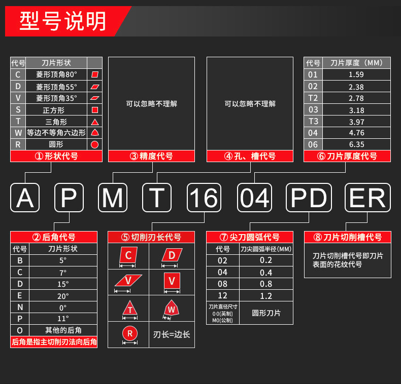 3、刀片的形狀(以下是幾類常見的型號(hào)) C 80°菱形 D 55°菱形 V 35°菱形 K 55°平行四邊形 R 圓形 S 90°正方形 T 60°正三角形 W 80°六角形 4、槽形 斷削槽的意義是什么?